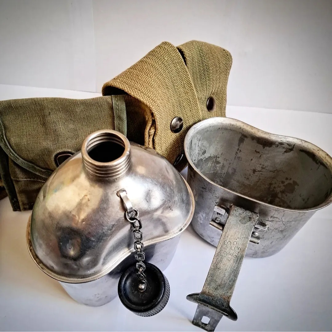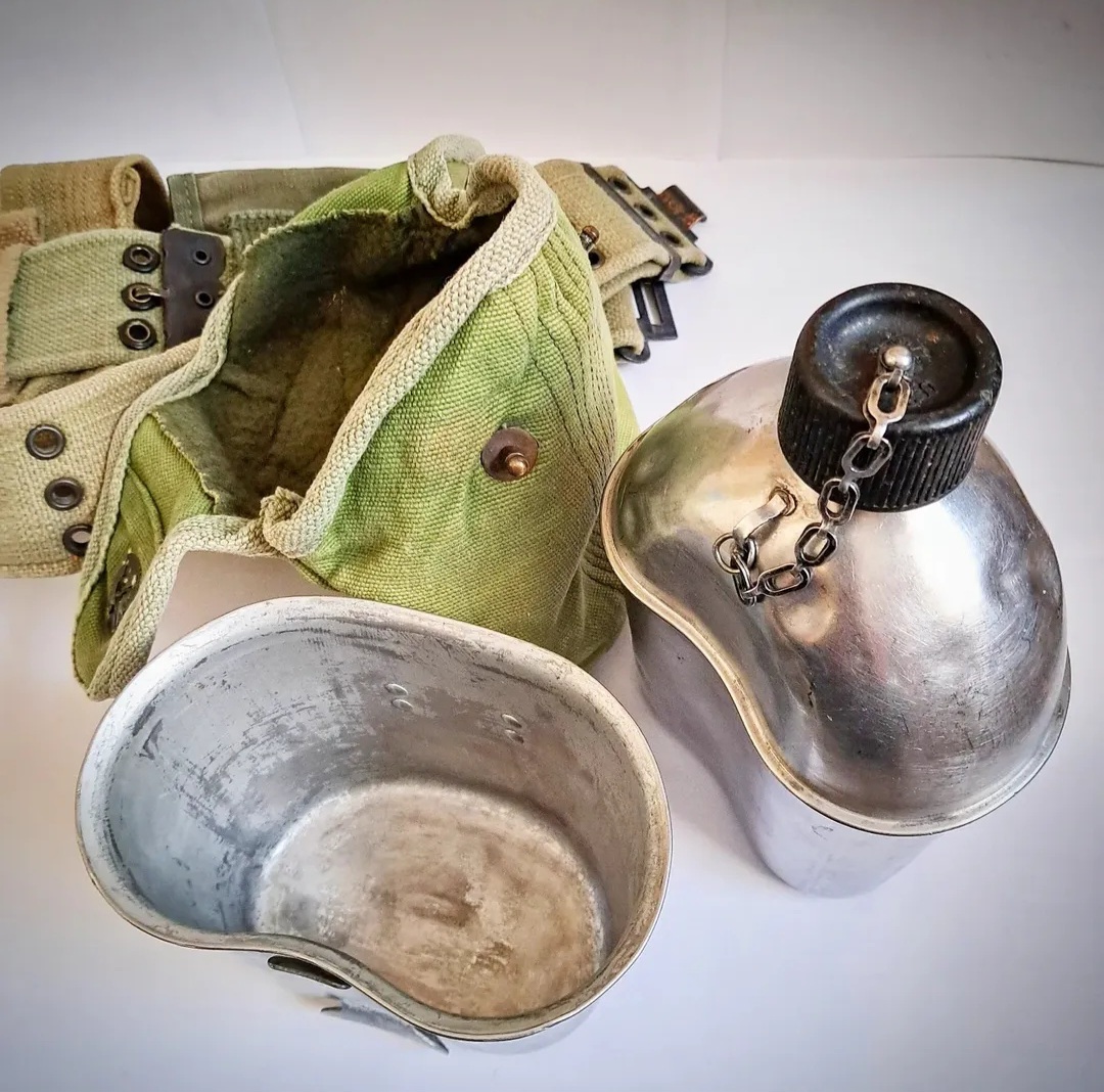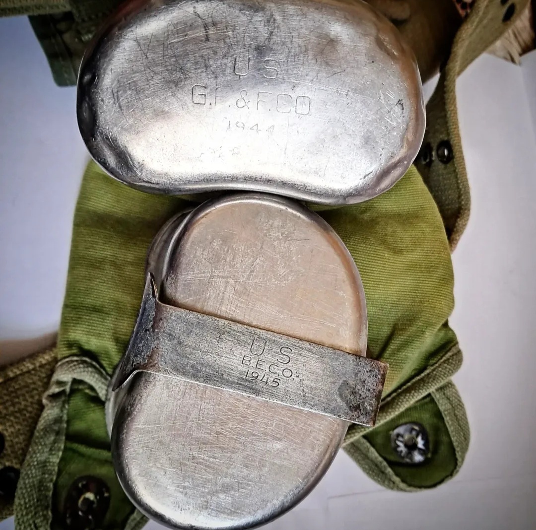 ست فانوسقه، جیب خشاب M1، جیب نارنجک دوتایی و قمقمه جنگی آمریکایی با کاور و یقلوی مربوط به جنگ جهانی دوم تاریخ تولید در زیر قمقمه ۱۹۴۴ و یقلوی ۱۹۴۵ حک شده است.